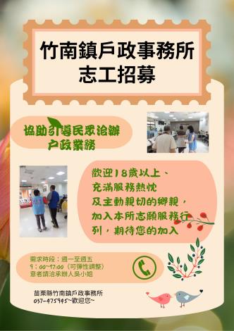 招募對象:歡迎18歲以上,具服務熱忱者。 服務內容:協助民眾取號、詢問及引導至櫃台等為民服務。 服務時段:上午9:00~12:00;下午14:00~17:00(可彈性調整)。 有意者電洽:(037)475945分機22 吳小姐